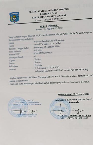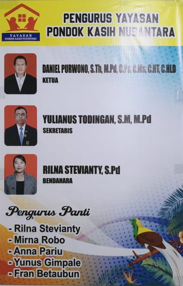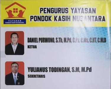 Yayasan Pondok Kasih Nusantara didirikan oleh Pdt. Daniel Purwono, S.Th., M.Pd, dengan dukungan istri tercinta Rilna Stevianti, S.Pd, serta rekan sepelayanan Yulianus Todingan, S.E.