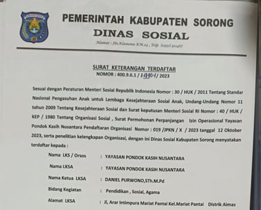 Pelayanan ini telah dimulai sejak tahun 2011 melalui bimbingan belajar, bahasa Inggris, dan pelatihan komputer. Oleh kemurahan Tuhan, yayasan ini resmi berbadan hukum pada tahun 2020 dan terdaftar di Kementerian Hukum dan HAM, Kesbangpol, serta Dinas Sosial Kabupaten Sorong.