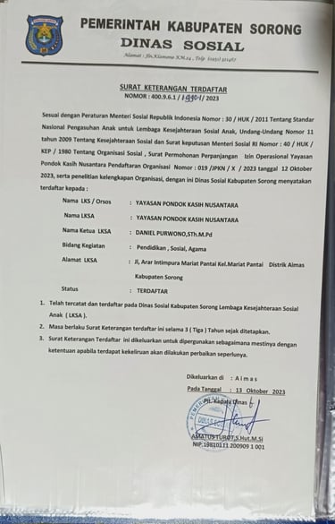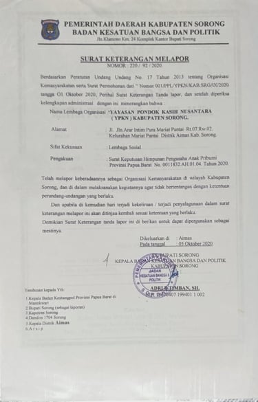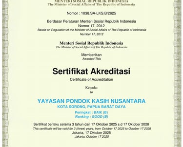 Yayasan Pondok Kasih Nusantara (Y-PKN) adalah lembaga sosial berbasis pendidikan dan panti asuhan yang telah melayani sejak tahun 2011. Kami berfokus pada pembinaan anak-anak yatim piatu serta anak dari keluarga kurang mampu melalui pendidikan, pembinaan karakter, dan pemberdayaan masyarakat.